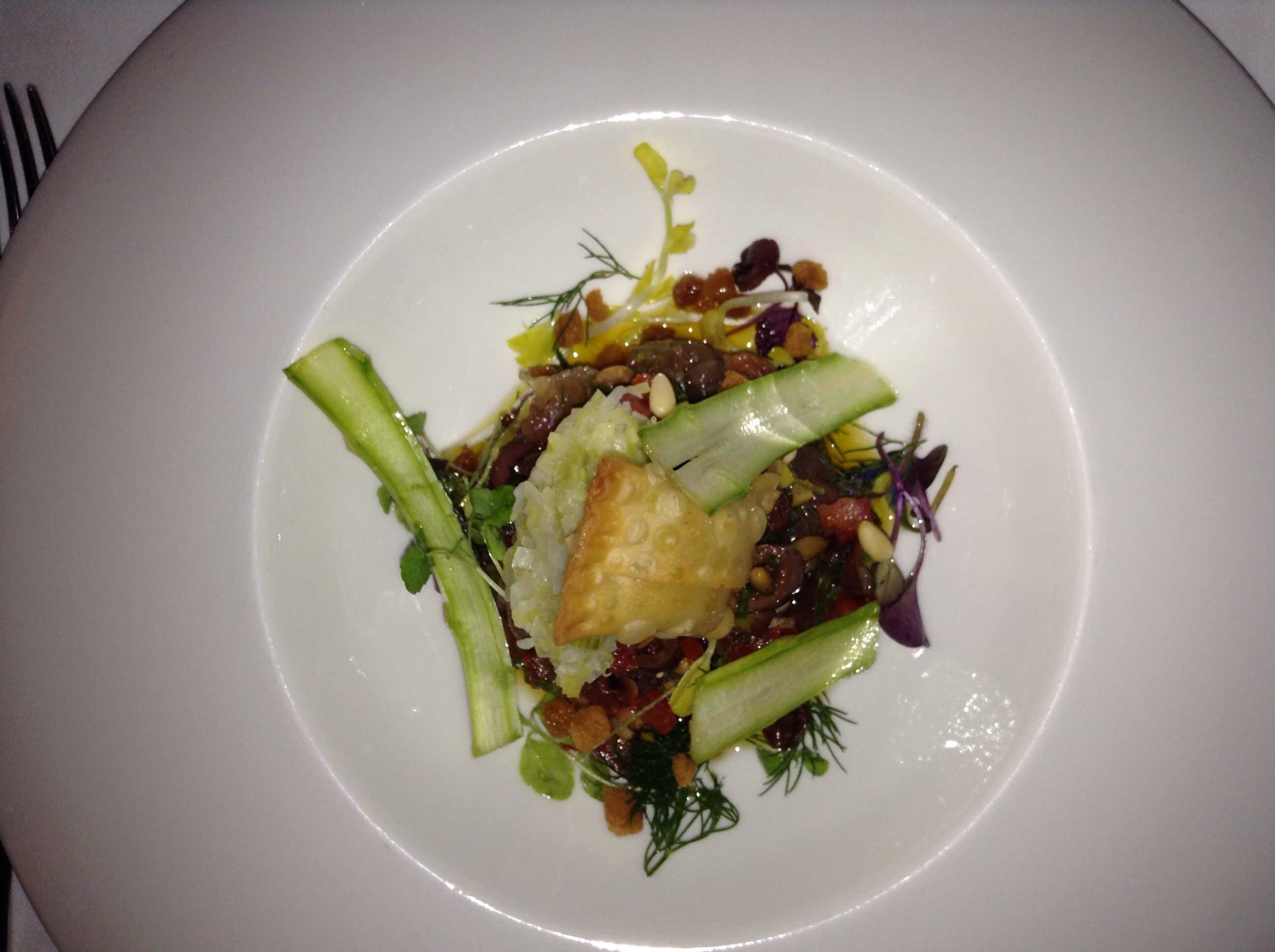 Ribbons of courgette in a dill dressing with red tuna tartare mixed with a piquant salsa of tomatoes, olives, capers, dill, parsley, red basil and breadcrumbs. I really loved this Provençal take on the Tuna Tartare and is now in my Top 10 favourite dishes.