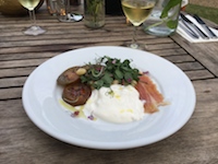 The lamb was pink and cooked to perfection and yet so tender it was like a rare fillet steak. The secret was in the fact that its slow cooked at a low temperature for several hours! Amazing! This was served with baby garlic new potatoes, turned carrots and a cannelloni made from ribbons of grilled aubergine, instead of pasta and stuffed with a Provençale farci mix of peppers and courgettes.